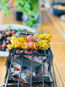Empezamos el viaje y descubrímos aquí la gastronomía tradicional marroquí. Un entrante que ha sido premiado como uno de los mejores platos de Madrid, nos traen un brasero de carbón sobre el que nosotros mismos podemos cocinar los pinchos morunos, el olor ya alimenta.